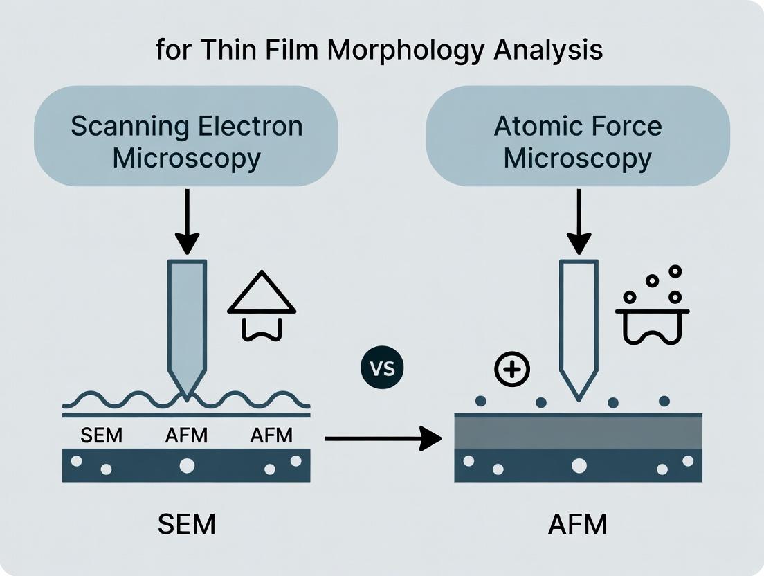 Scanning Electron Microscopy (SEM) and Atomic Force Microscopy (AFM) are cornerstone techniques for characterizing thin-film morphology, a critical parameter in fields ranging from semiconductor fabrication to pharmaceutical coating development. Selecting the appropriate tool—or a synergistic combination—requires a clear understanding of their respective principles, capabilities, and constraints.